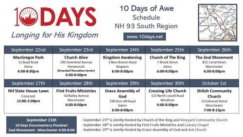 The 9/28 meeting will focus prayers on the theme, "Partnering With God." We will specifically pray for myriads to answer Yeshua's call on His followers to make disciples of all nations, baptizing them in the name of the Father, Son, and Holy Spirit, teaching them to observe all of the LORD's commandments. We will also pray for the diligence of Christian believers in New Hampshire and around the world to increasingly become disciple-making disciples of Yeshua as we seek to imitate the LORD, His Apostles, and those who follow the LORD with faith and perseverance as they trust in the promises of God. We will also pray for freedom from corruption, greed, and self-serving behaviors that prevent such spiritual growth in the faith community.
